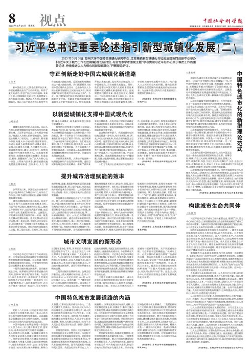 中国特色城市化是中国式现代化的重要组成部分。《习近平关于城市工作论述摘编》一书,对中国特色城市化的领导力量、发展道路、发展内容、发展理论等重大问题进行了全面的阐述,创建了中国特色城市化的新型理论范式。这既是对中国特色城市发展道路的理论和实践总结,又是对人类社会城市化发展一般规律的理论提炼和范式建构。