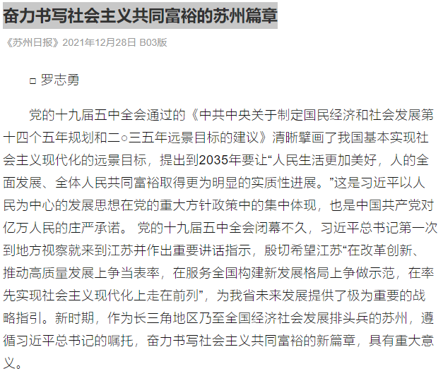 党的十九届五中全会通过的《中共中央关于制定国民经济和社会发展第十四个五年规划和二○三五年远景目标的建议》清晰擘画了我国基本实现社会主义现代化的远景目标,提出到2035年要让“人民生活更加美好,人的全面发展、全体人民共同富裕取得更为明显的实质性进展。”这是习近平以人民为中心的发展思想在党的重大方针政策中的集中体现,也是中国共产党对亿万人民的庄严承诺。 党的十九届五中全会闭幕不久,习近平总书记第一次到地方视察就来到江苏并作出重要讲话指示,殷切希望江苏“在改革创新、推动高质量发展上争当表率,在服务全国构建新发展格局上争做示范,在率先实现社会主义现代化上走在前列”,为我省未来发展提供了极为重要的战略指引。新时期,作为长三角地区乃至全国经济社会发展排头兵的苏州,遵循习近平总书记的嘱托,奋力书写社会主义共同富裕的新篇章,具有重大意义。