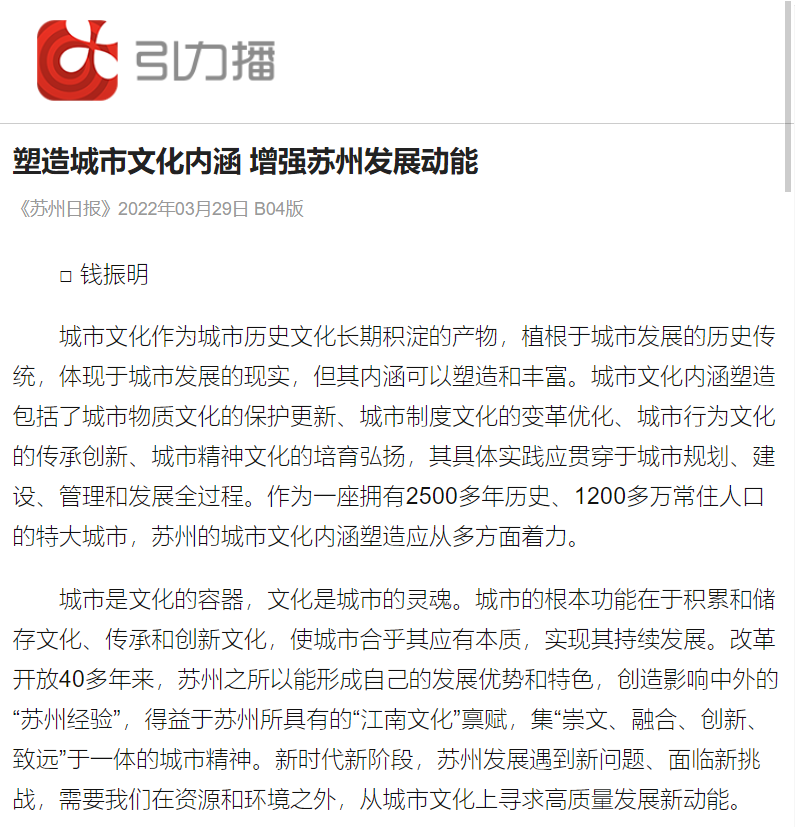 但是,在城市文化内涵塑造过程中,要避免“形象工程”,切忌追求“标志性建筑”数量,切忌轻人文精神,要力求整体协调、强化传统特色。城市文化要走向现代化,但文化的现代化建设不是也不能是不恰当地借鉴引进别国模式。城市文化内涵塑造要防止文化的西化和异化,要弘扬本土文化,坚持文化传承,延续历史文脉。苏州的新城建设和旧城改造,既有经验也有教训。一些岛山河湖,由于不恰当的人工改造而逐渐失去其本来的自然和原生态,一些贪大求洋的新建筑与既有的苏州历史文化名城风格迥异,缺乏应有的人与自然的和谐,因而也显得缺乏文化。当下,应借助城市更新的有序推进,既“留住记忆”“留住乡愁”,又激发城市文化现代化活力,提升城市文化软实力,为苏州可持续创新发展注入强大新动能。