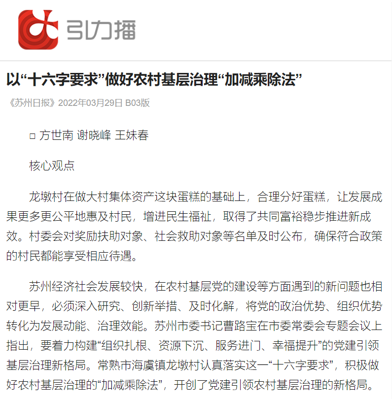 苏州经济社会发展较快,在农村基层党的建设等方面遇到的新问题也相对更早,必须深入研究、创新举措、及时化解,将党的政治优势、组织优势转化为发展动能、治理效能。苏州市委书记曹路宝在市委常委会专题会议上指出,要着力构建“组织扎根、资源下沉、服务进门、幸福提升”的党建引领基层治理新格局。常熟市海虞镇龙墩村认真落实这一“十六字要求”,积极做好农村基层治理的“加减乘除法”,开创了党建引领农村基层治理的新格局。