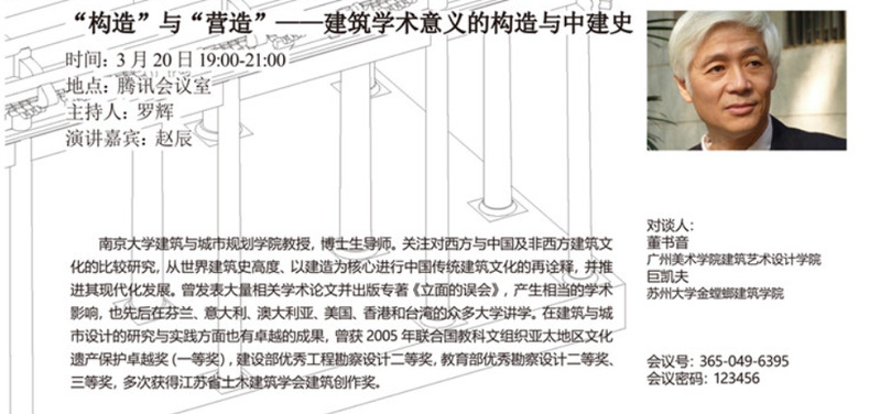 讲座中,赵辰教授首先作出对于“土木/营造”原型的溯源,从多个“土木/营造”中木构与土构的角色中总结出“土木/营造”的原型具有深远的时空意义;而后,赵辰教授解读了“土木/营造”的规律与形制,通过对“三分”的详述,提出“土木/营造”的规律与形制具有强大文化认同的观点;最后,赵辰教授讲解了“土木/营造”的造型拓展和大体量建造原理并举例分析,提出中国建筑师有必要在学术意义上理解“土木/营造”的主题。此次讲座我校百余名师生和校外三百余名师生线上参与。
