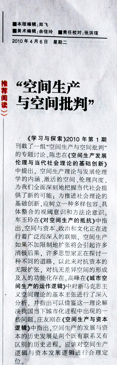 2010年4月6日,《中国社会科学报》在17版“推荐阅读”栏目向读者推荐本中心研究人员陈忠、车玉玲、高峰、庄友刚等撰写,发表于《学习与探索》2010年第1期的“空间生产与空间批判”系列论文。近来,本中心研究成果不断被《中国社会科学文摘》、《人民大学报刊复印资料》等转载。
