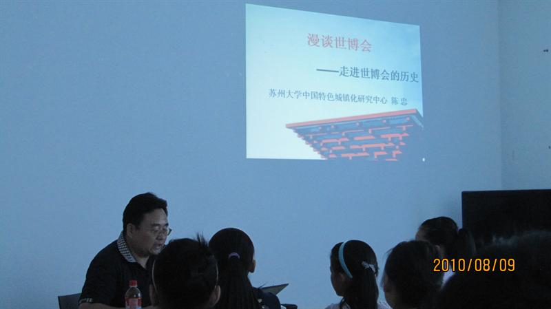 8月9日上午,苏州大学中国特色城镇化研究中心主任陈忠教授,到苏州沧浪区觅渡社区,为暑假中的中小学生开公益讲座。陈忠教授以“漫谈世博会——走进世博会的历史”为题,围绕世博会与文明、世博会与城市化、什么是好的城市等,向中小学生普及、介绍了世博会及城市学的有关知识。以多种形式为社会服务、普及城镇化知识,是苏州大学中国特色城镇化研究中心一直以来非常重视的一项工作,今后,中心将进一步加大这方面工作的力度。