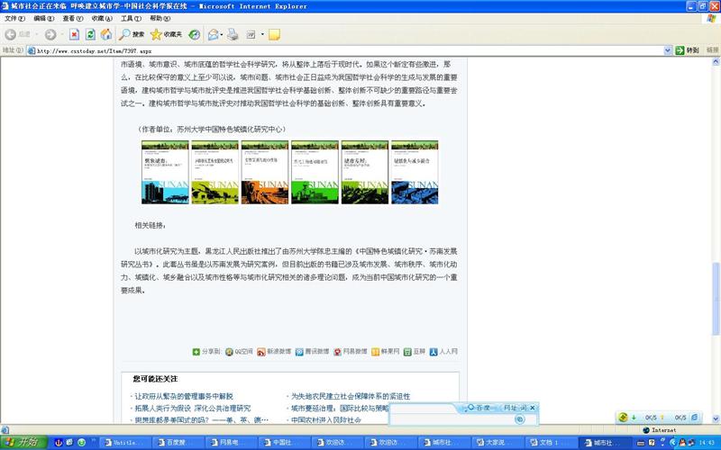 2011年10月20日出版的第231期《中国社会科学报》,以图文并茂的形成推介了本中心最近推出的研究丛书。认为“以城市化研究为主题,黑龙江人民出版社推出了由苏州大学陈忠主编的《中国特色城镇化研究·苏南发展研究丛书》。此套丛书虽是以苏南发展为研究案例,但目前出版的书籍已涉及城市发展、城市秩序、城市化动力、城镇化、城乡融合以及城市性格等与城市化研究相关的诸多理论问题,成为当前中国城市化研究的一个重要成果。”