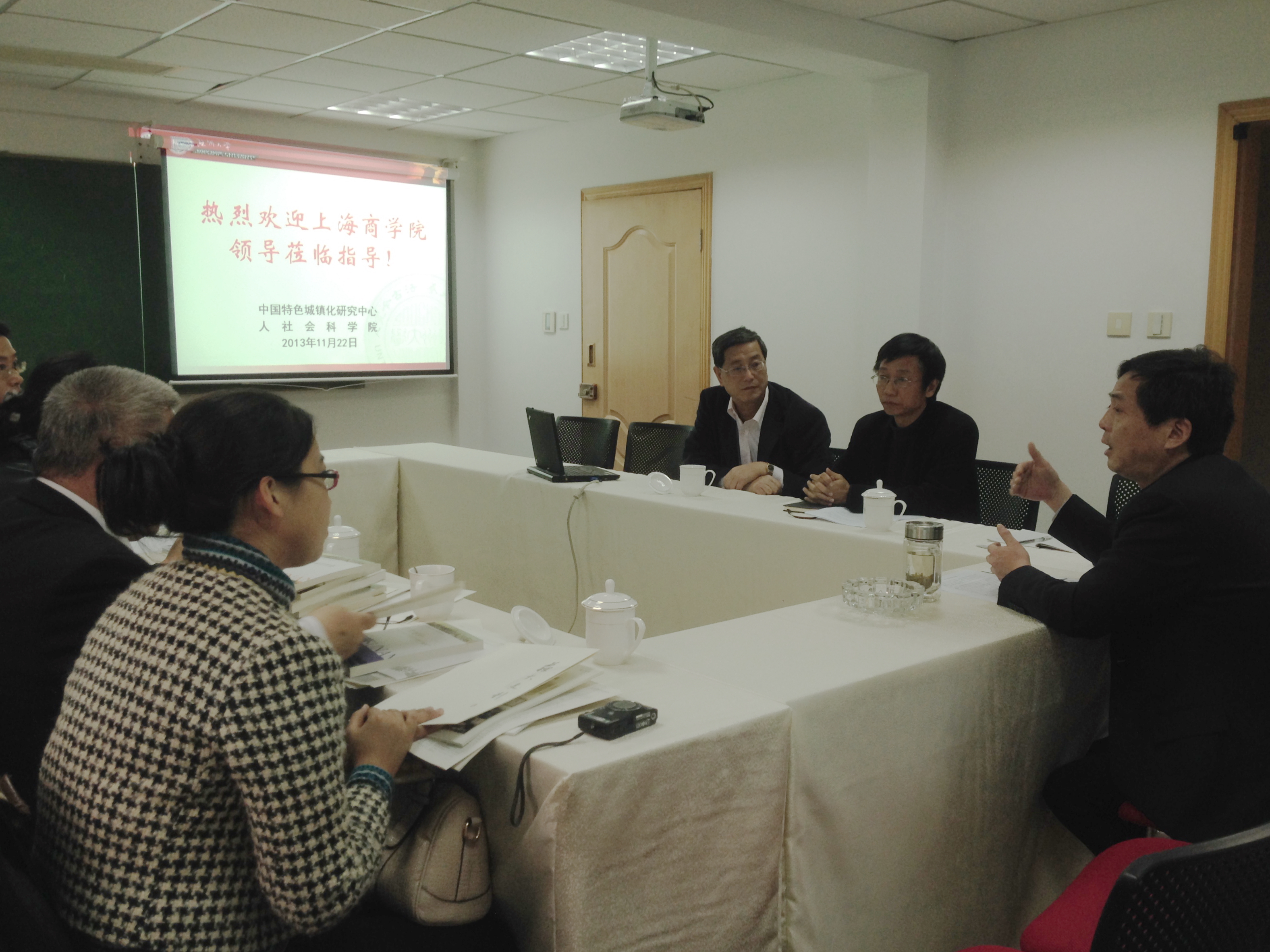 2013年11月22日下午,上海商学院商业发展研究院副院长刘斌一行六人来我中心交流。我校人文社会科学院常务副院长母小勇教授,中国特色城镇化研究中心副主任段进军教授、行政副主任徐维英出席了座谈会。