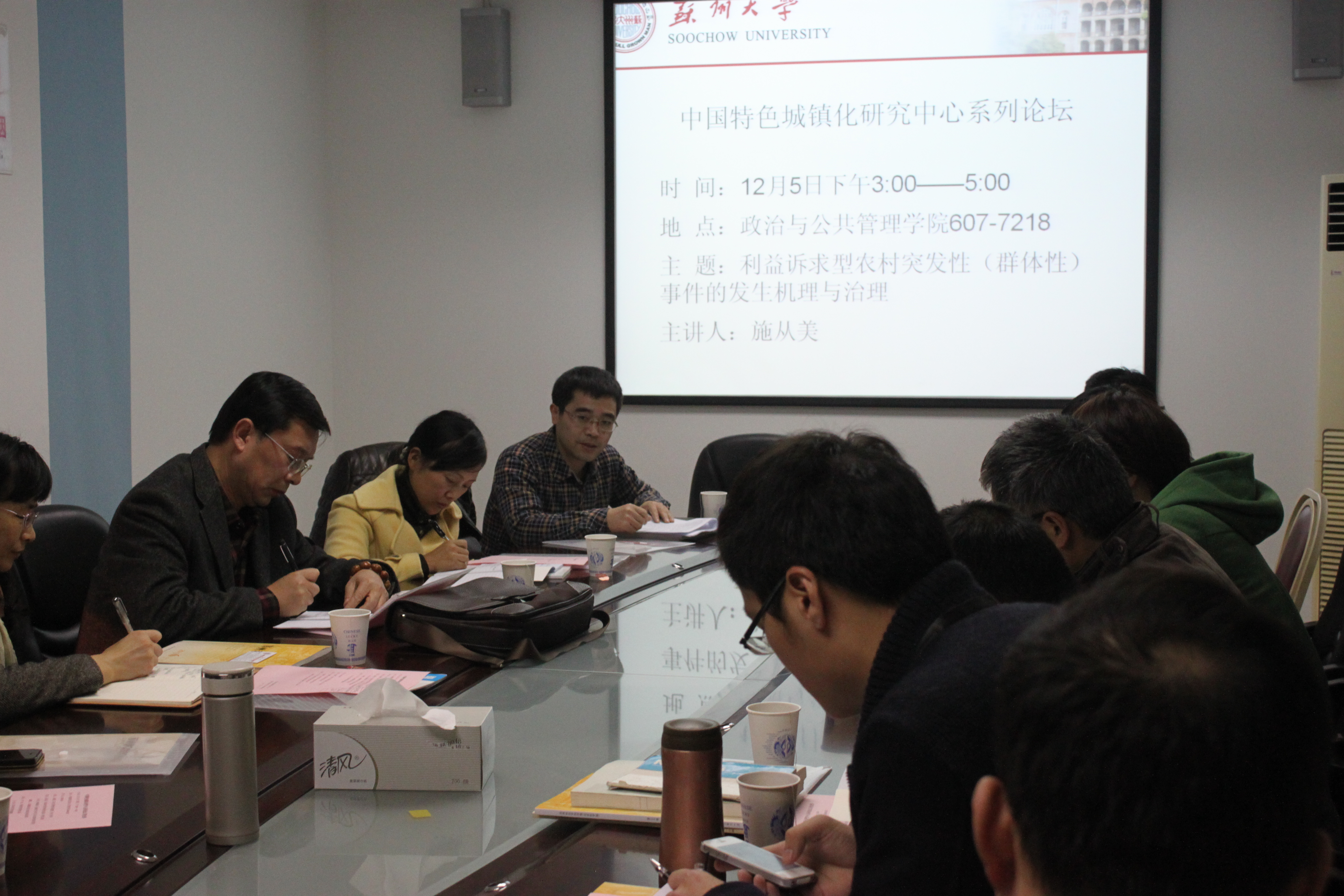 2013年12月5日下午,中国特色城镇化研究中心系列论坛(之七十、七十一)“环境群体性事件治理”、“利益诉求型农村突发性事件的发生机理与治理”联合在独墅湖校区607幢7218会议室举行。政治与公共管理学院钮菊生教授、张劲松教授、施从美副教授、沈承诚老师,苏州教育学院学报主编李政研究员、副主编时新老师,苏州科技学院学报编辑张燕博士,以及部分研究生参加了此次论坛。论坛由钮菊生教授主持。