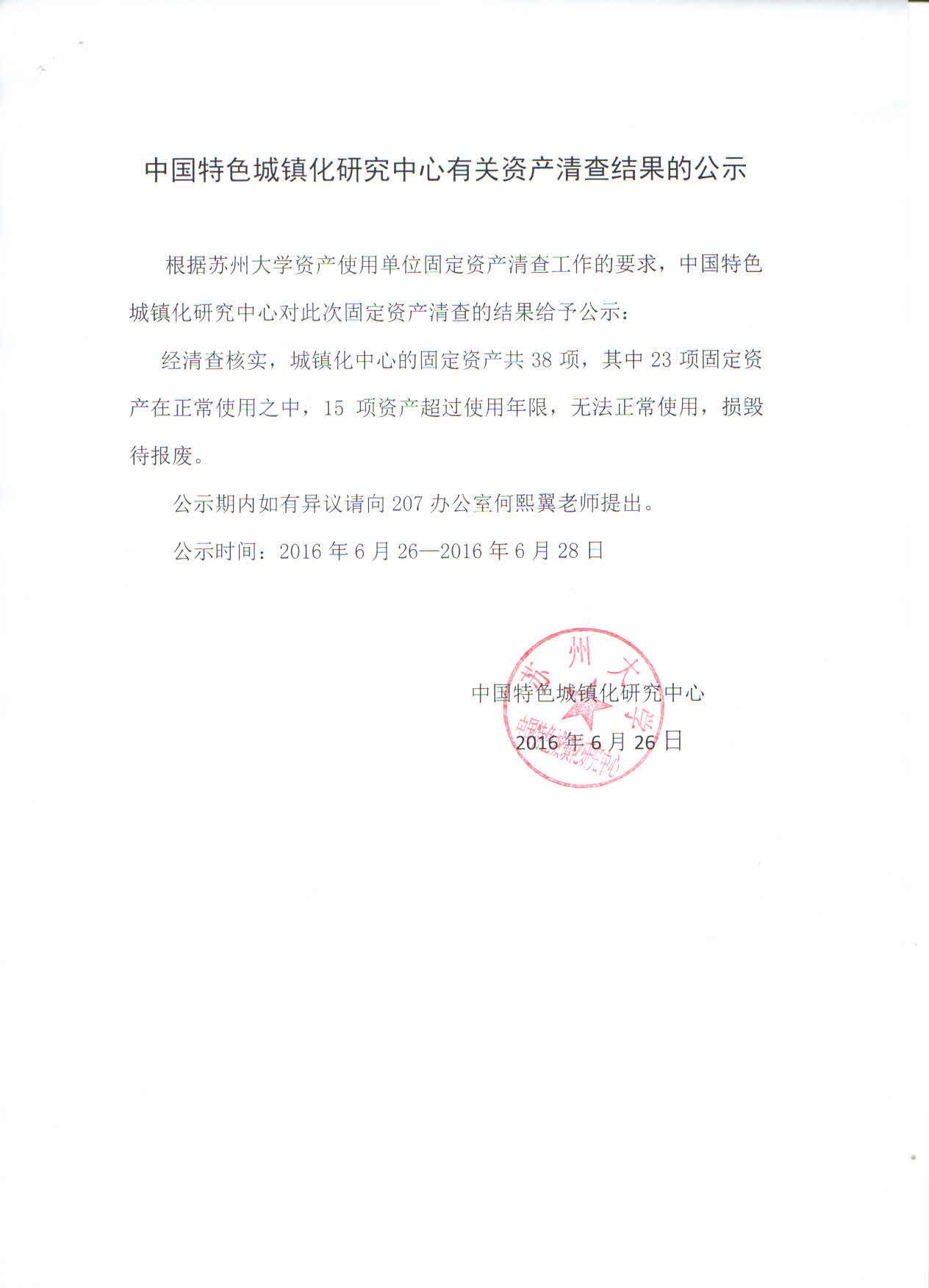 根据苏州大学资产使用单位固定资产清查工作的要求,中国特色城镇化研究中心对此次固定资产清查的结果给予公示: