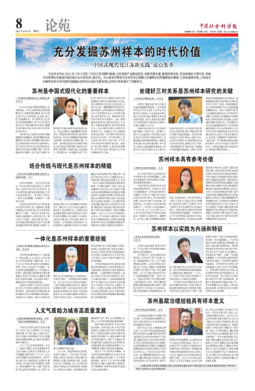 习近平总书记7月5日至7日在江苏考察时强调,江苏拥有产业基础坚实、科教资源丰 富、营商环境优良、市场规模巨大等优势,有能力也有责任在推进中国式现代化中走在 前、做示范。为认真学习贯彻习近平总书记考察江苏重要讲话和重要指示精神,江苏省委 宣传部、江苏省社科联和苏州大学中国特色城镇化研究中心组织专家学者以苏州为样本进 行了专题研讨。