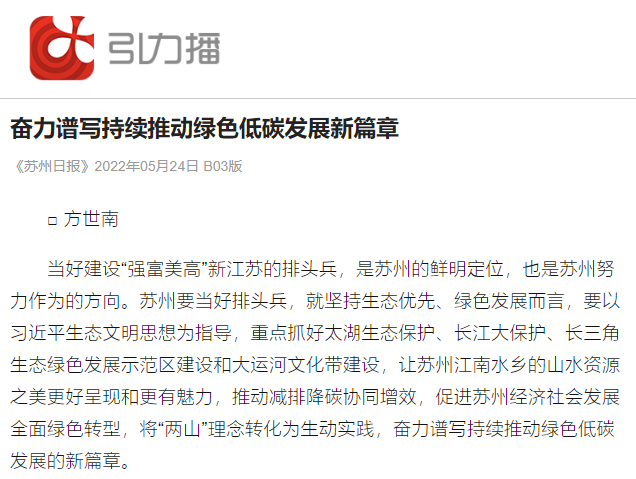 当好建设“强富美高”新江苏的排头兵,是苏州的鲜明定位,也是苏州努力作为的方向。苏州要当好排头兵,就坚持生态优先、绿色发展而言,要以习近平生态文明思想为指导,重点抓好太湖生态保护、长江大保护、长三角生态绿色发展示范区建设和大运河文化带建设,让苏州江南水乡的山水资源之美更好呈现和更有魅力,推动减排降碳协同增效,促进苏州经济社会发展全面绿色转型,将“两山”理念转化为生动实践,奋力谱写持续推动绿色低碳发展的新篇章。