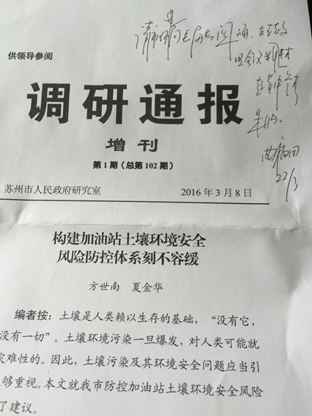 我中心研究员、马克思主义学院教授方世南和苏州市中科慧盛生态环境研究所所长夏金华的《构建加油站土壤环境安全风险防控体系刻不容缓》一文,刊发在苏州市人民政府研究室2016年3月8日《调研通报》第1期上。2016年3月22日,苏州市市长曲福田作了如下重要批示:“请市环保局毛局长阅研。在生态文明会议材料起草中予以采纳。”