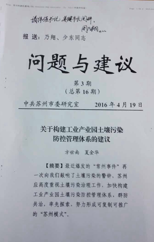 方世南教授领衔的团队在常州毒土事件以前就开展了构建防范土壤污染风险体系问题的系统研究,连续多次向市委市政府建言加强土壤环境安全风险防控,调研报告《关于加强建设用地土壤环境安全风险防控的建议》,刊发在苏州市委研究室2016年2月16日《决策参考》第6期。2月24日,苏州市委书记周乃翔作了重要批示。《构建加油站土壤环境安全风险防控体系刻不容缓》一文,刊发在苏州市人民政府研究室2016年3月8日《调研通报》第1期上,苏州市市长曲福田作了重要批示。
