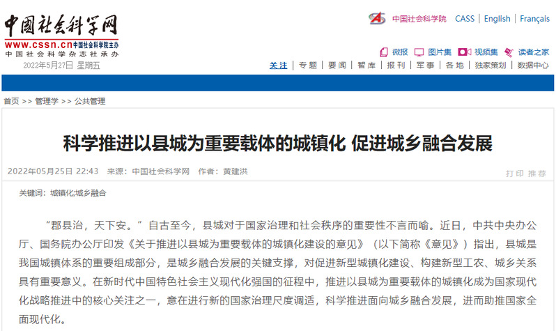 科学推进以县城为重要载体的城镇化 促进城乡融合发展