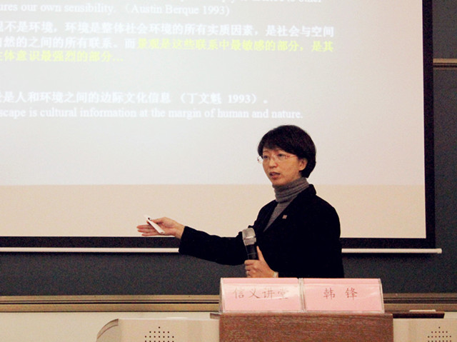 随后,韩锋教授又说明了景观的三大特征:第一,在广义上,景观存在于自然和人的相互作用中;第二,景观不能独立于自身文化而存在;第三,景观需要创造力。她总结道:人和自然的关系构成最基本的景观哲学基础,景观是人与自然的共同作品。在人与自然的环境哲学方面,她提出:在今天,关于人和自然的道德关系的西方传统伦理学已经得到一定程度的拓展,西方反省了人类中心主义,即以奴役、征服、掠夺为主旋律的自然观,把人与人的道德关系推向人与自然,她举了人际关系相处的例子,十分生动。