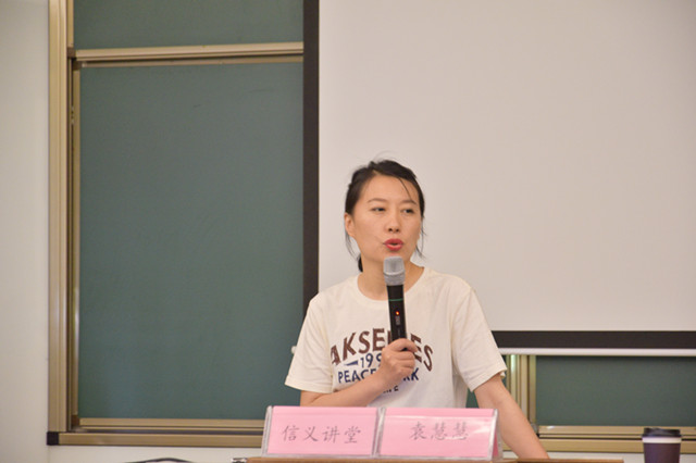 首先,袁慧慧老师提出:用什么方式证明时间存在过?用什么样的方式记录生活?她通过自己的案例,介绍了什么是行为艺术并回答之前提出的问题。袁老师通过列举伊夫克莱因以及克莱因蓝的例子,向大家解释了如何用思维和行为过程进行创造以及自由的生命活动。她具体介绍了行为艺术特征及其艺术流派。行为艺术是以特定环境为依托进行特有的艺术创造,平凡中蕴含着深刻。而行为艺术流派则包括身体艺术、激浪行为艺术、概念艺术及过程艺术等四种形式。袁老师通过列举玛丽娜阿布拉莫维奇不断探索身体与精神极限行为的例子,来诠释行为艺术之母以及现代西方行为艺术。