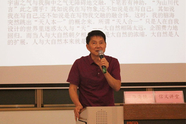 首先,华海镜教授阐述观点:“天人本一”是自己绘画的心得体会,即在自然中作画,当场写生,大尺幅作画;“知行并进”是自己基于对陶行知的“知行文化”和王阳明的“知行合一”提出的自己的观点,意为认知若想有突破,就不能在“合一”上纠结太久。华教授就绘画中的“天人本一”做了形象的比喻:自然是母,自己是父,作品则是子女,并向与会师生诠释了当场写生就是要与自然碰撞,与自然共舞。