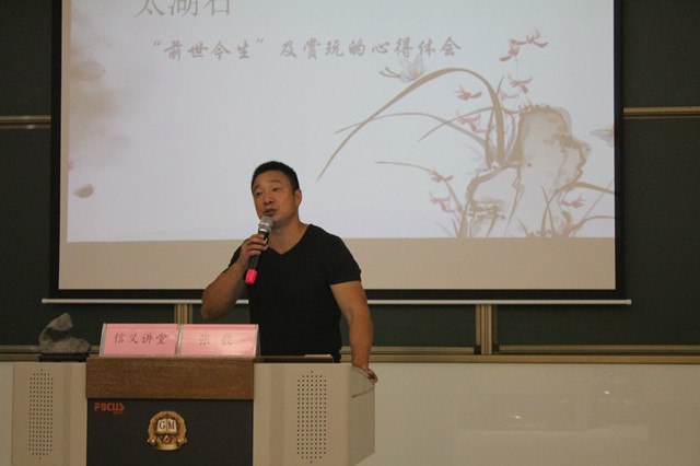 随后,张毅老师以图片、视频的方式向与会师生介绍了各类型的太湖石,如江苏太湖石、安徽太湖石等及不同颜色的太湖石,并展示了一些与石相关的古画,向大家普及了四大名石的产地情况和挑选石头,挖出石头的过程。