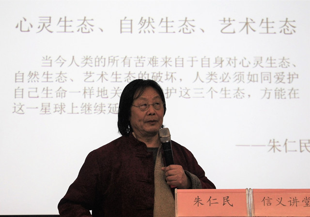 首先,朱仁民教授指出,人类要像爱护自己的生命一样维护心灵生态、自然生态、艺术生态这三个生态,才能在地球上继续延续下去。随后,朱教授介绍了自己在过去几十年中寻找被人类破坏过的各类典型荒蛮地貌进行艰苦卓绝的修复工作的经历,这些生态修复工程投入已近千亿,涉及荒岛、荒沙、荒滩、湿地、运河、裸崖、黄河、建桥、修路等领域,其个人在公益事业方面的投入近六千万。接着,朱教授用他的实践解决了生态和GDP不能共存的难题,证明了生态和GDP可以同时发展。他逐一介绍了一些经典修复案例,例如:银川市鸣翠湖国家湿地公园(荒沙修复)、宁夏金水园黄河旅游度假区(黄河修复)、普陀莲花岛(荒岛修复)、胜利河古运河生态改造(运河修复)、湖州菱湖国际艺术家村(湿地修复)及普陀山码头旅游集散中心(裸涯修复)等。