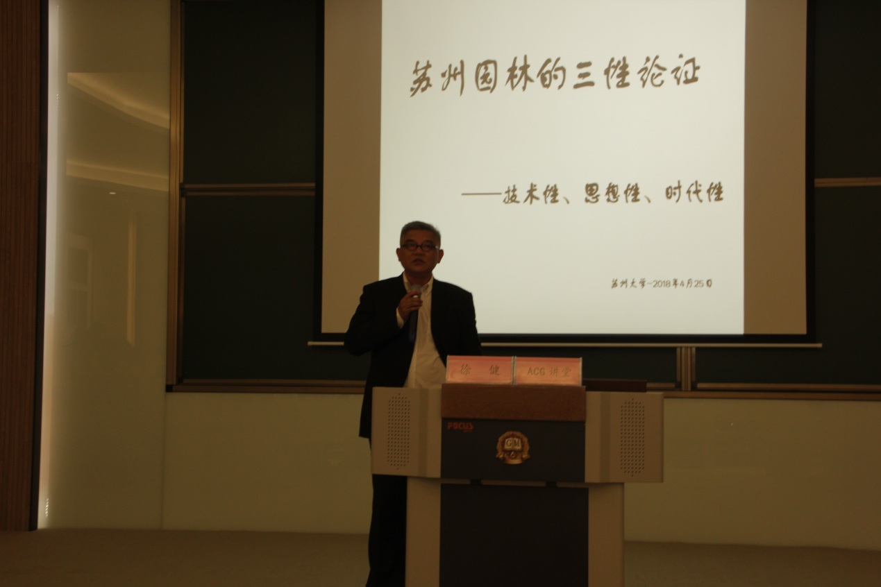 首先,徐健院长简要介绍了自己参与静思园和上海世博会景观设计、施工并与园林专家合作《苏州古典园林史》、《庞湖史话》、《静思园艺术片》等优秀作品的经历,以及与建筑园林结下的深厚渊源。随后,徐院长从苏州园林的技术性论证开始讲解,就营造园林的技术性而言,明代计成的《园冶》诠释了造园的手法;宋代的李诫《营造法式》将各种制式的建筑设计及制作工艺技术交代得十分详细;当代园林营造技术,应该在传承古人建筑制造的基础上利用现代科学技术创新发展:一是手工与机械的结合;二是制式传统加简约。接着,他对苏州园林的思想性进行论证,大概为以下几点:1、三分工匠七分主人;2、构园无格;3、园林文化和园林艺术是苏州园林的核心价值,先有人文,后有园林,二者缺一不可。最后,他详细阐述了苏州园林的时代性,并认为时代的标准就是建筑风格和建筑材料的新的表现形式,建筑是一个时代的政治经济文化的缩影,打开园林画卷,便知那个时代的风格特点。同时,他表示汲古图新,营造具有时代特色的苏式园林是历史赋予我们的使命。