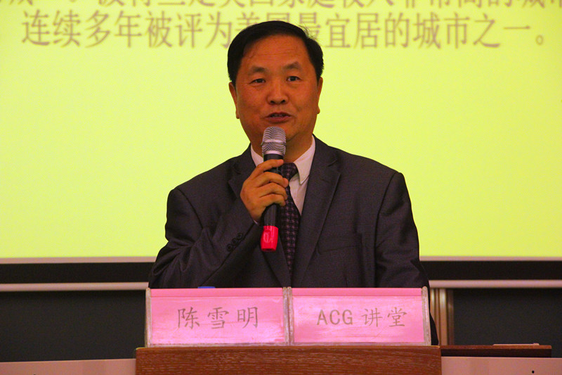 陈教授首先带领师生从波特兰的地理位置、气候等方面初步认识、了解波特兰市,随后用地图展示了波特兰的位置与地形,介绍波特兰的规划设计特色:建立不带任何建筑的绿化带以限制城市的扩张;强调城市的密度而不是豪宅;发展轻轨系统等。接着,陈教授从城市生长边界、公交优先策略、波特兰政府等几个方面详细讲解了波特兰市的规划成功因素。陈教授在讲座汇总还介绍了美国加州尔湾的成功案例,从教育、经济、人口发展及地理位置等方面详细分析,从五个时间阶段分别讲解了尔湾发展的关键年,内容丰富而有条理。之后陈教授又讲解了尔湾的城市规划史、精明增长原则、产城融合分析等,并进行了中西的对比,指出尔湾发展的最主要特征与成功的要素。