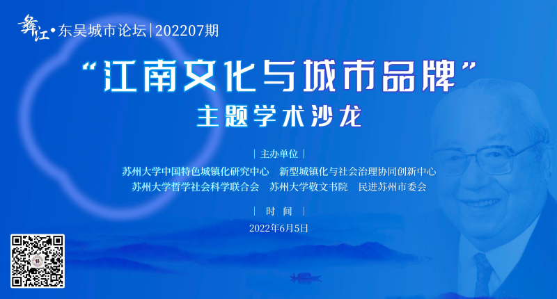 6月5日下午,苏州大学中国特色城镇化研究中心、新型城镇化与社会治理协同创新中心、苏州大学哲学社会科学联合会、苏州大学敬文书院、民进苏州市委会共同举办彝江·东吴城市论坛202207期“江南文化与城市品牌”主题学术沙龙。