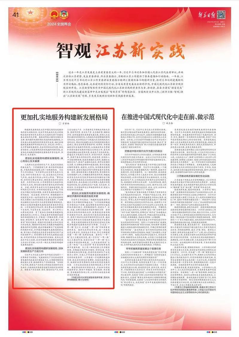 2024年3月5日,《新华日报》“智观·江苏新实践”版块封面刊登中心城市风险与生态城市研究所所长方世南教授的文章《更加扎实地服务构建新发展格局》。文章从江苏新发展格局的实践出发,提出“决心和信心”在建设道路上的重要性,强调要坚定“加快发展新质生产力”的前进方向,确保“经济畅通无阻”,将国家政策优势转化为推动高质量发展优势。