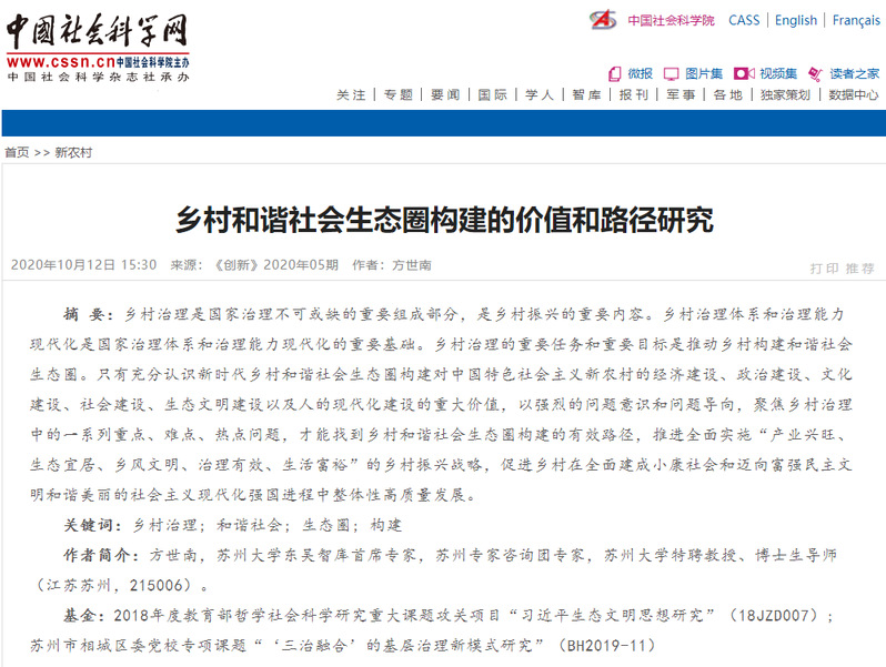 近日,中国社会科学网刊登了苏州大学中国特色城镇化研究中心特聘研究员方世南教授《乡村和谐社会生态圈构建的价值和路径研究》一文。