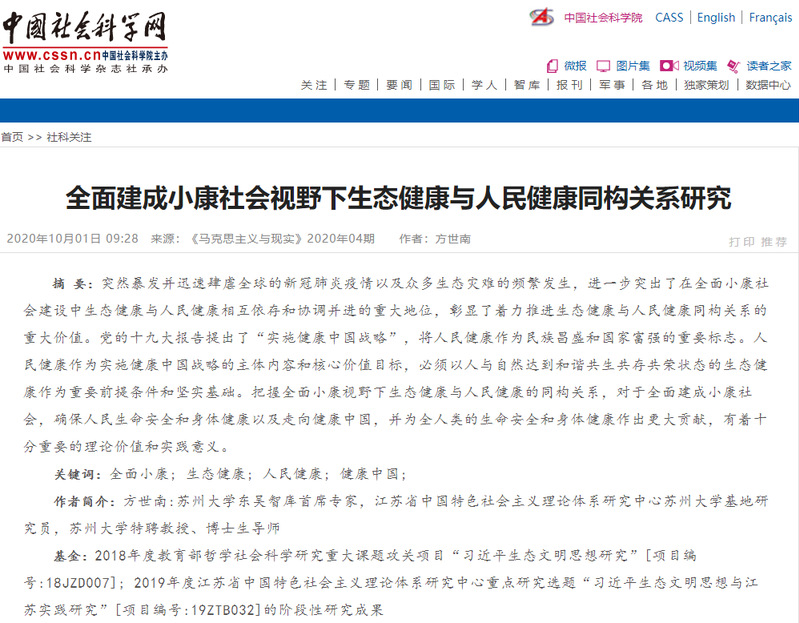 近日,中国社会科学网刊登了苏州大学中国特色城镇化研究中心特聘研究员方世南教授《全面建成小康社会视野下生态健康与人民健康同构关系研究》一文。文章从基本内涵、内在同构关系、实践路径三方面进行全面剖析。