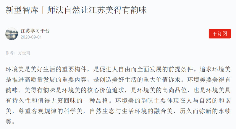 2020年9月1日,“学习强国”江苏学习平台刊载苏州大学中国特色城镇化研究中心特聘研究员方世南教授的观点文章《师法自然让江苏美得有韵味》。文章指出,环境美的韵味主要体现在人与自然的和谐美,尊重客观规律的科学美,自然生态与生活环境的融合美,历久而弥新的永续美。
