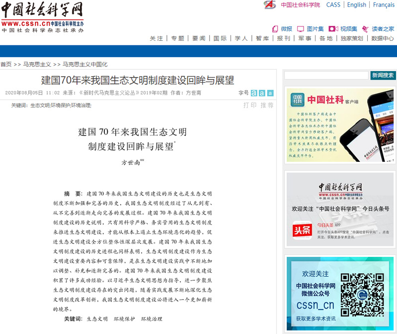 近日,中国社会科学网刊登了苏州大学中国特色城镇化研究中心特聘研究员方世南教授《建国70年来我国生态文明制度建设回眸与展望》一文。