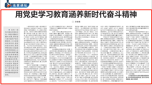 2021年3月30日,《苏州日报》、“学习强国”刊登了苏州大学中国特色城镇化研究中心特聘研究员方世南教授的观点文章《用党史学习教育涵养新时代奋斗精神》。该文深刻阐述了开展党史学习教育对于涵养新时代奋斗精神的重要性,并提出用党史学习教育涵养新时代奋斗精神应做到知史爱党、知史爱民、知史爱岗,为全面领会党史学习的主要内容指明了方向。