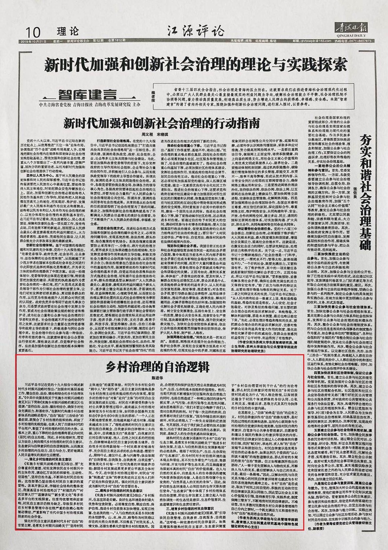 2019年10月21日,《青海日报》刊载苏州大学中国特色城镇化研究中心主任陈进华教师理论文章《乡村治理的自治逻辑》。文章指出,乡村治理研究,需要从方法论上转向现代乡村治理的村民自主意识、生态意识与自律意识的自治逻辑建构,从而激发乡村治理的内生动力、活力与合力,更好地满足人民日益增长的美好生活需要。