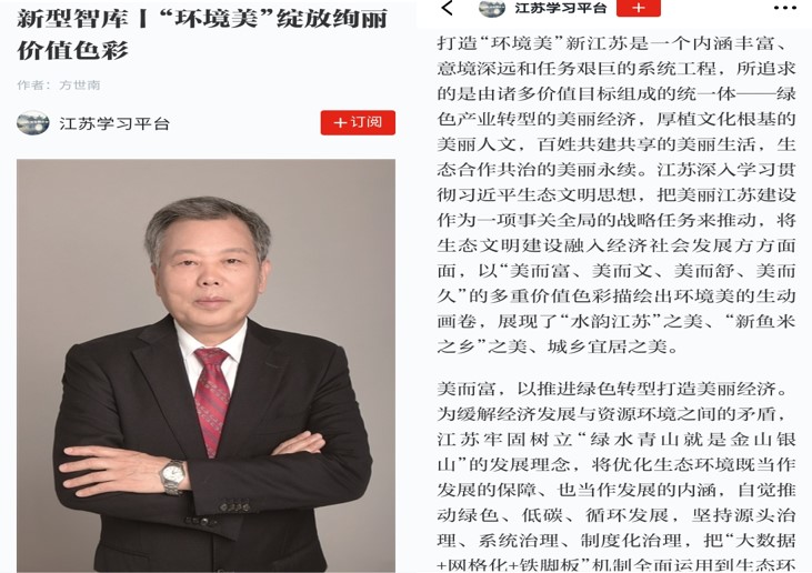 2020年07月21日,“学习强国”江苏学习平台刊载苏州大学中国特色城镇化研究中心特聘研究员方世南教授的观点文章《“环境美”绽放绚丽价值色彩》。文章指出,打造“环境美”新江苏是一个系统工程,并提出了打造“环境美”的若干方向。