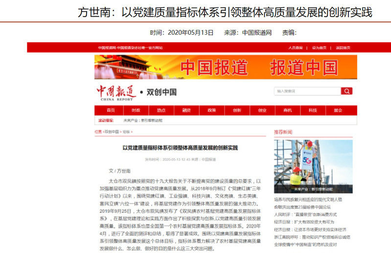 2020年5月13日,中国报道网刊登了苏州大学中国特色城镇研究中心特聘研究员方世南教授的观点文章《以党建质量指标体系引领整体高质量发展的创新实践》。该文深刻阐述了党建指标体系着力解决了农村基层党建高质量发展做什么、怎么做、做好的目的是什么的三大突出问题。