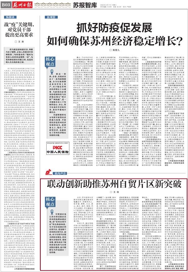 3月17日,《苏州日报》“苏报智库”栏目刊登苏州大学中国特色城镇研究中心研究员王俊教授的文章《联动创新助推苏州自贸片区新突破》。文章指出,对于自贸片区现相关的所有事宜,苏州要从全局出发,谋划布置,要发动各个板块和条线参与自贸试验区建设。