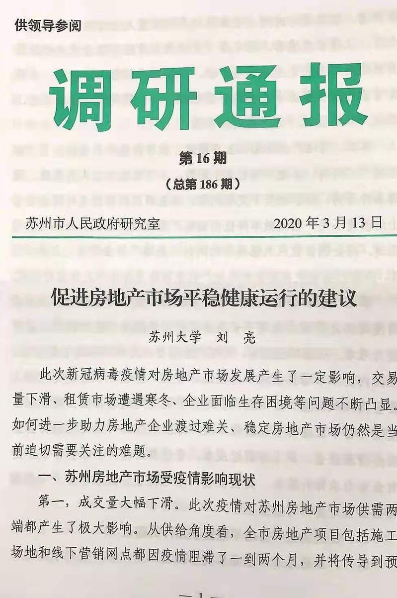 苏州大学中国特色城镇研究中心积极落实要求、响应号召。针对新型冠状病毒肺炎疫情防控工作,研究中心学者开展理论探索与政策建言,助力科学防治、精准施策,构筑好群防群治的严密防线,坚决打赢疫情防控阻击战。近日,《调研通报》第16期刊登苏州大学中国特色城镇研究中心研究员刘亮教授的文章《促进房地产市场平稳健康运行的建议》。