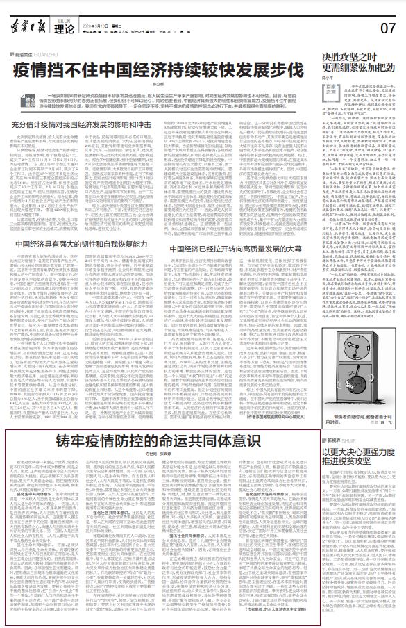 苏州大学中国特色城镇研究中心积极落实要求、响应号召。针对新型冠状病毒肺炎疫情防控工作,研究中心学者开展理论探索与政策建言,助力科学防治、精准施策,构筑好群防群治的严密防线,坚决打赢疫情防控阻击战。近日,《辽宁日报》刊登苏州大学中国特色城镇研究中心特聘研究员方世南、苏州大学马克思主义学院张云婷的文章《铸牢疫情防控的命运共同体意识》。