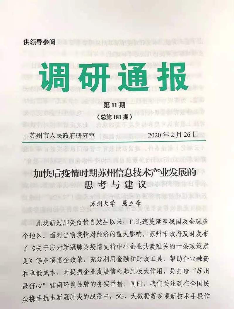 苏州大学中国特色城镇研究中心积极落实要求、响应号召。针对新型冠状病毒肺炎疫情防控工作,研究中心学者开展理论探索与政策建言,助力科学防治、精准施策,构筑好群防群治的严密防线,坚决打赢疫情防控阻击战。近日,《调研通报》2020 年第11期刊登苏州大学中国特色城镇研究中心研究员屠立峰教授的文章《加快后疫情时期苏州信息技术产业发展的思考与建议》。