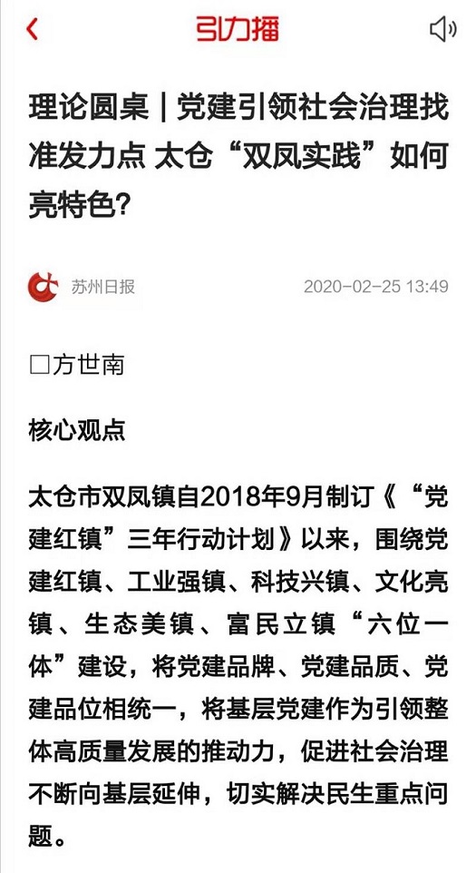 2020年2月25日,“引力播”刊登了苏州大学中国特色城镇化研究中心特聘研究员方世南教授的观点文章《党建引领社会治理找准发力点 太仓“双凤实践”如何亮特色?》。文章以太仓双凤镇“党建红镇”实践为例,深刻阐述了党建在基层治理中的引领作用,党建引领社会治理向深处走,向细处走,向优处走。