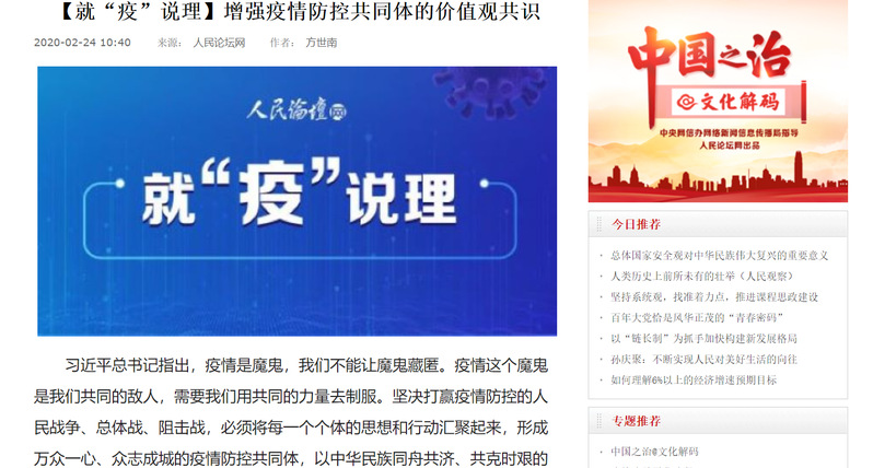 苏州大学中国特色城镇研究中心积极落实要求、响应号召。针对新型冠状病毒肺炎疫情防控工作,研究中心学者开展理论探索与政策建言,助力科学防治、精准施策,构筑好群防群治的严密防线,坚决打赢疫情防控阻击战。近日,人民论坛网刊登苏州大学中国特色城镇研究中心特聘研究员方世南教授的文章《增强疫情防控共同体的价值观共识》。