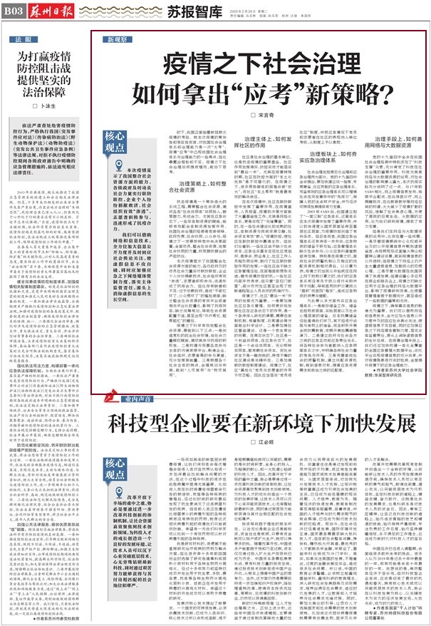 苏州大学中国特色城镇研究中心积极落实要求、响应号召。针对新型冠状病毒肺炎疫情防控工作,研究中心学者开展理论探索与政策建言,助力科学防治、精准施策,构筑好群防群治的严密防线,坚决打赢疫情防控阻击战。近日,《苏州日报》“苏报智库”版块刊登苏州大学中国特色城镇研究中心研究员宋言奇教授的文章《疫情之下社会治理:如何拿出 “应考”新策略? 》。