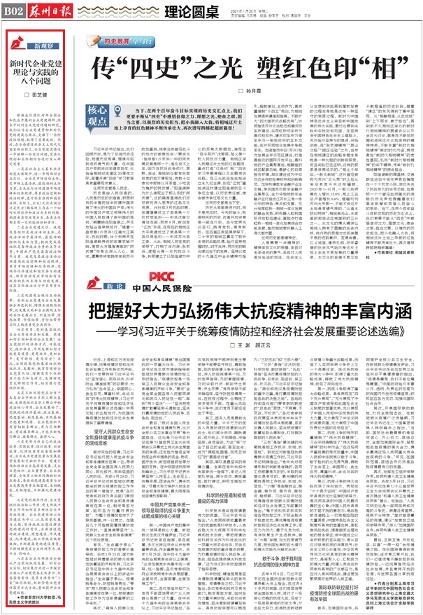 近日,《苏州日报》刊登了苏州大学中国特色城镇化研究中心研究员田芝健的文章《新时代企业党建理论与实践的八个问题》。文章指出,通过对部分国企和民企开展的企业党建调研,结合平时对企业党建问题的研究,在全面建设社会主义现代化国家新征程上,企业党建需要进一步破解一些前沿问题,需要从理论和实际相结合进行深入研究思考。