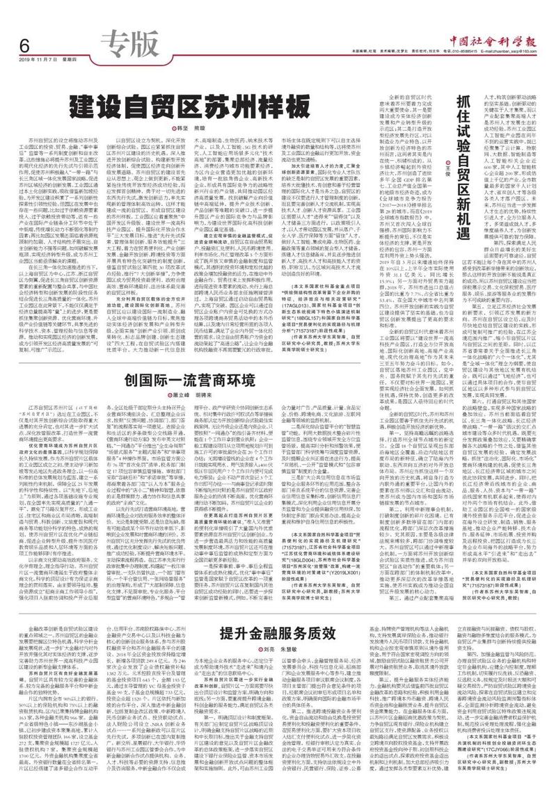 2019年11月7日,《中国社会科学报》第6版专版刊登了苏州大学中国特色城镇化研究中心研究成果,王俊、韩坚、屠立峰和刘亮四位研究员就“苏州自贸片区建设”这一主题发表观点。