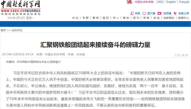 2019年10月,中国社会科学网刊载了苏州大学中国特色城镇化研究中心特聘研究员方世南教授的理论文章《汇聚钢铁般团结起来接续奋斗的磅礴力量》,文章指出要汇聚起钢铁般团结起来接续奋斗的磅礴力量要做到“六个必须“。