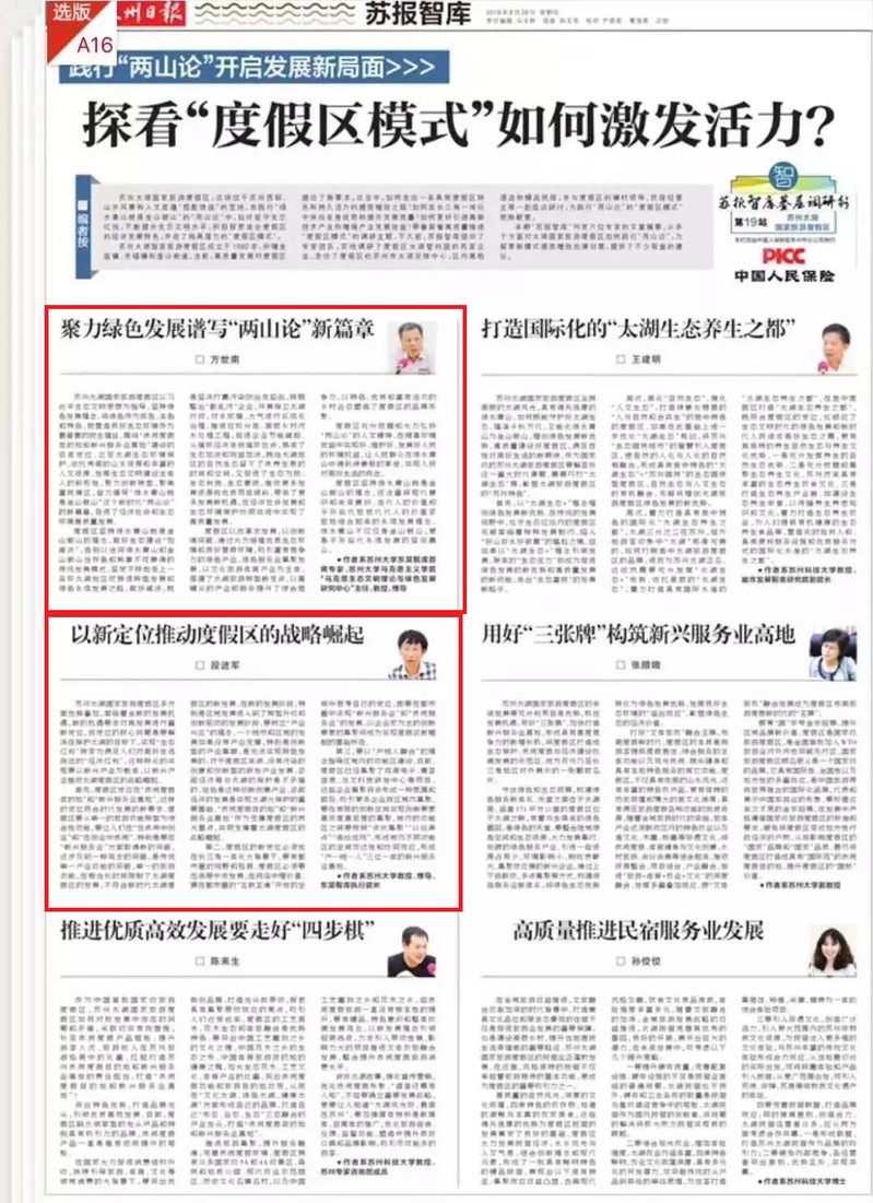 近日,《苏州日报》刊发六位专家的文章摘要,从多个方面对太湖国家旅游度假区如何践行“两山论”,为探索新模式提质增效出谋划策,提供了不少有益的建议。苏州大学中国特色城镇化研究中心特聘研究员方世南教授、研究员段进军教授分别以《聚力绿色发展谱写“两山论”新篇章》《以新定位推动度假区的战略崛起》为题,为践行“两山论”的“度假区模式”把脉献策。