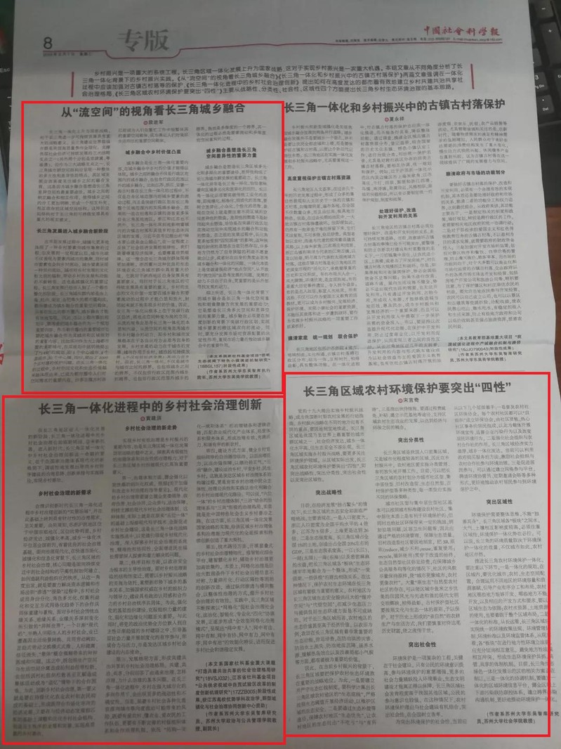 2019年8月7日,《中国社会科学报》第8版专版苏州大学中国特色城镇化研究中心研究员段进军教授、黄建洪教授和宋言奇教授的研究成果,文章从不同角度分析了长三角一体化背景下的乡村振兴实践。