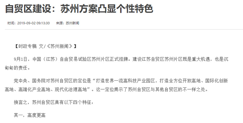 2019年9月1日,中国(江苏)自由贸易试验区苏州片区正式挂牌。“苏州新闻”刊载了苏州大学中国特色城镇化研究中心研究员王俊教授《自贸区建设:苏州方案凸显个性特色》一文,文章重点阐述了苏州自贸区的四大特征。