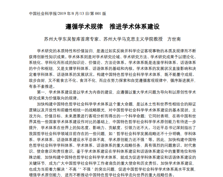 8月13日,《中国社会科学报》头版刊登了苏州大学中国特色城镇化研究中心特聘研究员方世南教授的文章《遵循学术规律 推进学术体系建设》。文章指出,构建中国特色哲学社会科学学术体系,应在努力探索和自觉遵循客观规律中,循序渐进展开,有条不紊推进。文章从以学术为内容、以学科为平台、以方法论为指导、以学术繁荣为目的四个方面详细阐释了学术体系建设的推进规律。