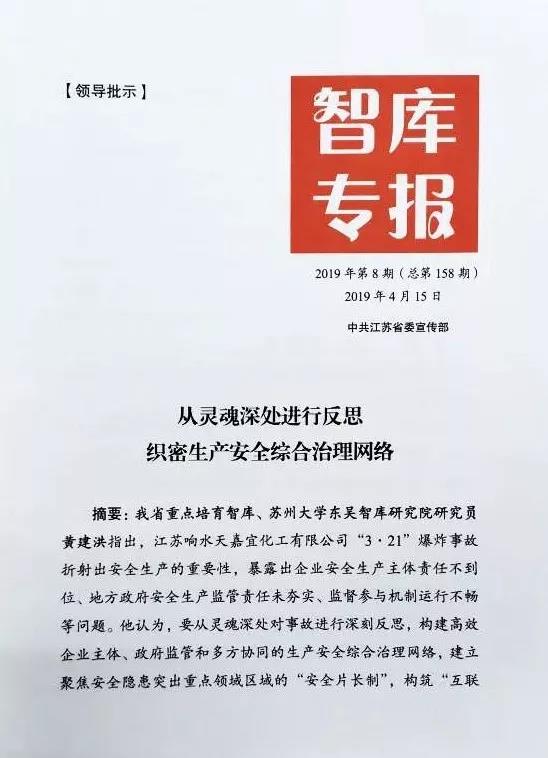近日,中共江苏省委宣传部主办的《智库专报》2019年第8期刊发苏州大学中国特色城镇化研究中心研究员黄建洪教授研究成果《从灵魂深处进行反思 织密生产安全综合治理网络》。