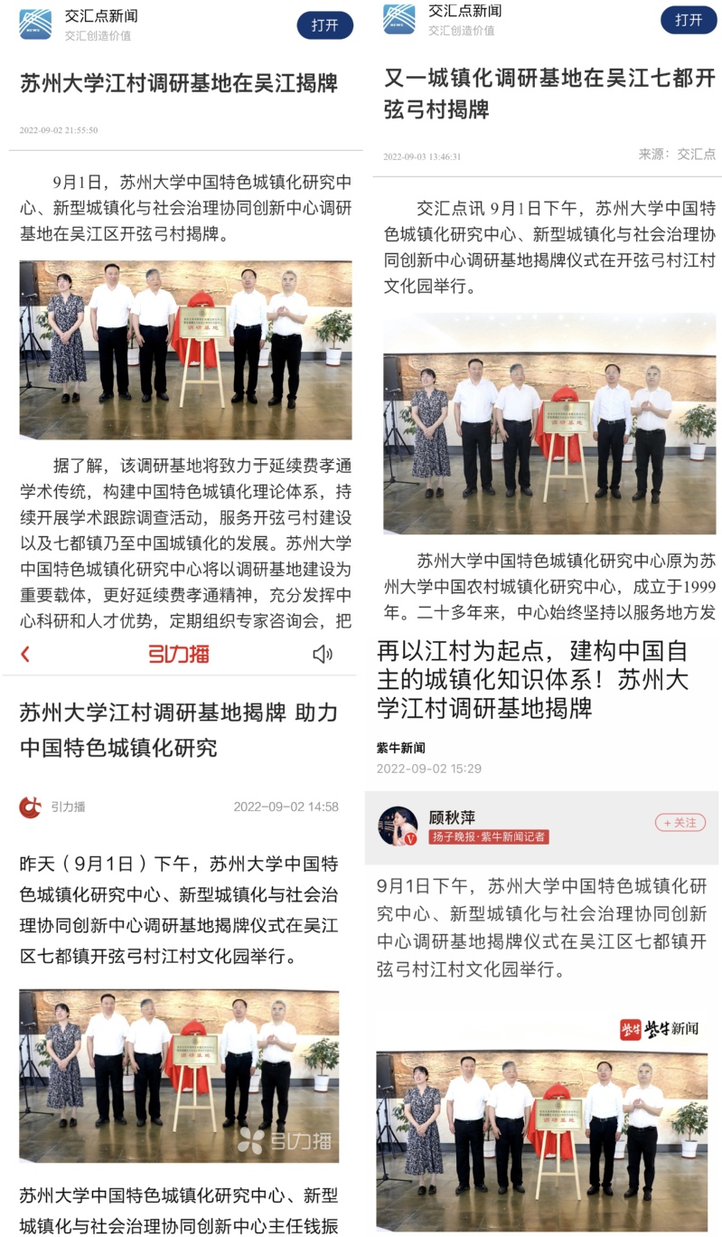 9月1日下午,苏州大学中国特色城镇化研究中心、新型城镇化与社会治理协同创新中心调研基地揭牌仪式在开弦弓村江村文化园举行。现将各平台报道内容整理汇编如下。