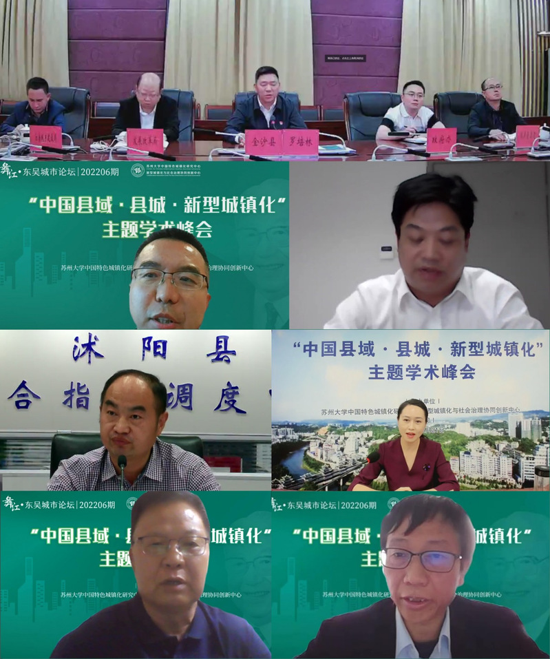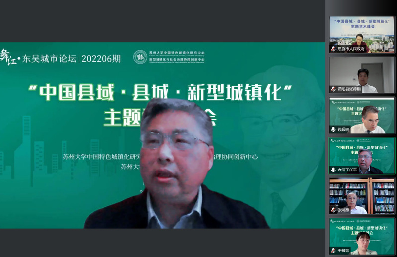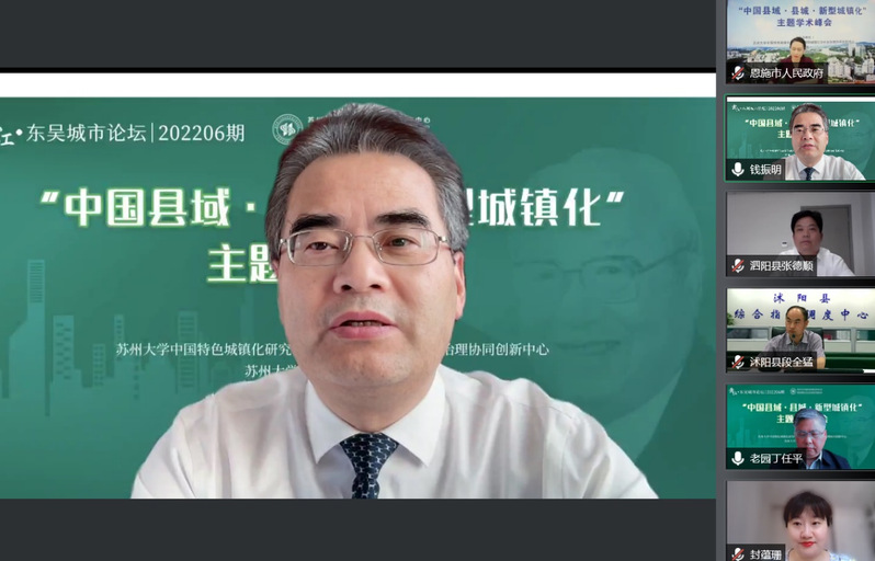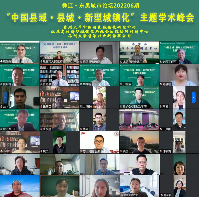 为迎接党的二十大胜利召开,学习研究阐释《关于推进以县城为重要载体的城镇化建设的意见》,助力新发展阶段中国新型城镇化战略实践发展和理论进展,5月21日下午,由苏州大学中国特色城镇化研究中心、新型城镇化与社会治理协同创新中心、苏州大学哲学社会科学联合会共同举办的彝江·东吴城市论坛202206期“中国县域·县城·新型城镇化”主题学术峰会举行。来自国务院发展研究中心、中国社会科学院、清华大学、南京大学、苏州大学等高校和科研机构的城镇化研究领域专家、学者,江苏省发展改革委有关部门负责人,甘肃省天水市、湖北省恩施市、贵州省金沙县、江苏省沭阳县和泗阳县等地党委、政府有关负责同志,应邀到会作主旨报告或专题发言。苏州大学中国特色城镇化研究中心、新型城镇化与社会治理协同创新中心全体专兼职研究人员,苏州大学传媒学院、社会学院、政治与公共管理学院、马克思主义学院、东吴商学院、王健法学院、金螳螂建筑学院、东吴智库等相关学院、单位师生代表参加会议。受疫情影响,本次学术峰会采用网络视频会议方式举行,腾讯视频、苏州日报引力播、哔哩哔哩三大平台同步在线直播,观看人数达11.7万余人。